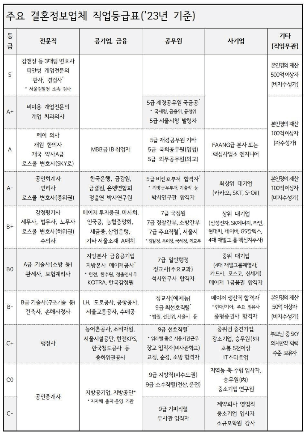 결혼정보업체에서 발표한 직업 등급표와 결혼 등급표입니다. 하지만 실제로 상담을 진행하면 해당 등급표와는 다른 결과가 나올 수 있습니다. 이 등급표는 참고용으로만 사용하시기 바랍니다.