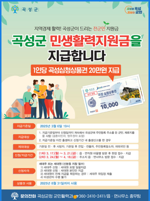 이번 민생활력지원금이 어려운 시기를 보내고 계신 곡성군민들께 조금이나마 도움이 되길 바랍니다.