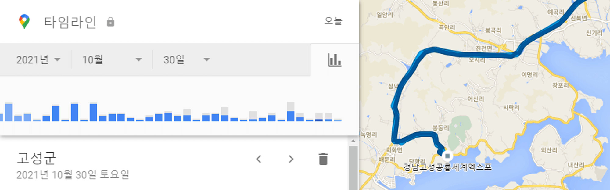 구글 지도의 타임라인 기능을 활용하여 최근 위치를 간단하게 확인할 수 있습니다. 이 기능을 이용하면 최근에 다녀온 장소들을 쉽게 확인할 수 있습니다. 예를 들어, 저는 최근 고성엑스포에 다녀왔는데, 이 장소가 타임라인에 잘 표시되어 있습니다.