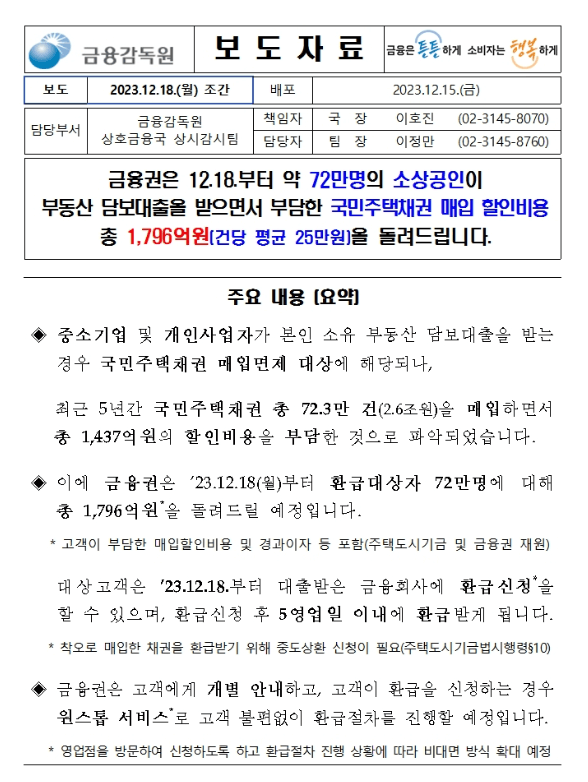 금융감독원은 17일 국민주택채권 매입면제 대상자에 따른 착오 매입을 하지 않은 72만명에게 국민주택채권 부동산 담보대출 소상공인 환급금을 지급합니다.
