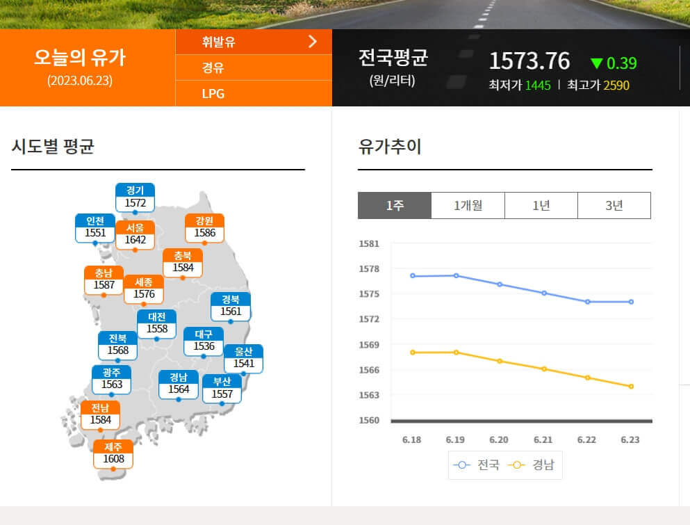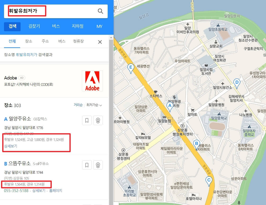 지도 어플을 이용하는 방법이 있습니다. 카카오지도와 네이버 지도가 대표적입니다. 해당 지도에서는 주유소에서 판매하는 기름의 가격을 확인할 수 있습니다.