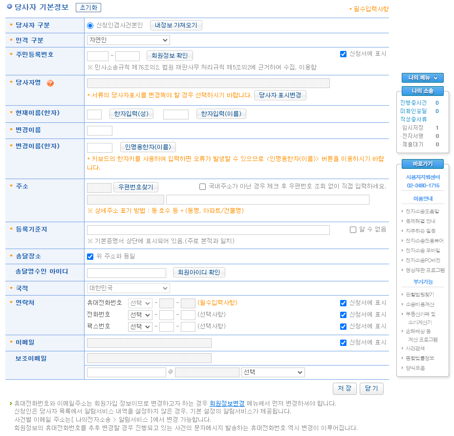 - 관할법원을 선택하여 본안사건 없음을 체크하고 정보를 입력합니다.