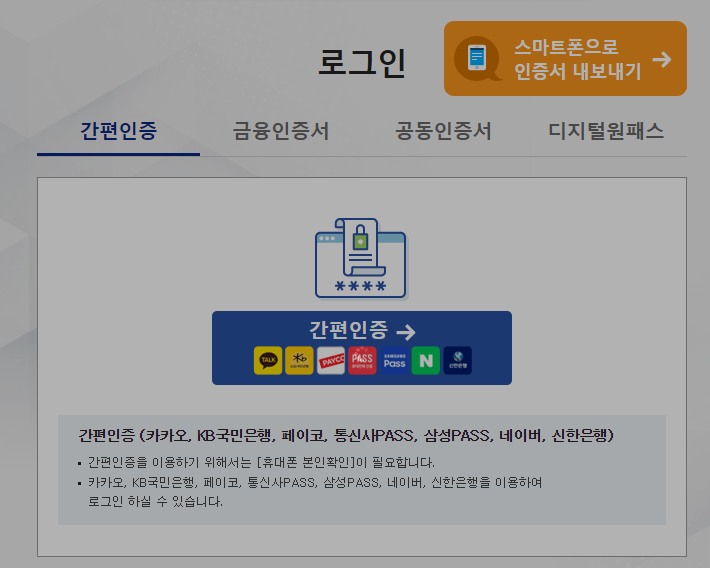 3) 로그인을 합니다. 로그인 방법은 간편인증, 금융인증서, 공동인증서, 디지털원패스 방법이 있으니 편하신 방법을 선택하셔서 로그인하시면 됩니다.