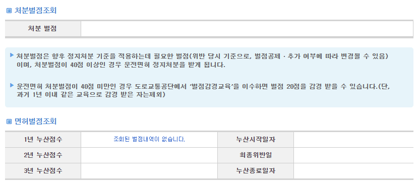 4) 로그인을 하면 바로 아래와 같이 본인의 벌점을 확인하실 수 있습니다.