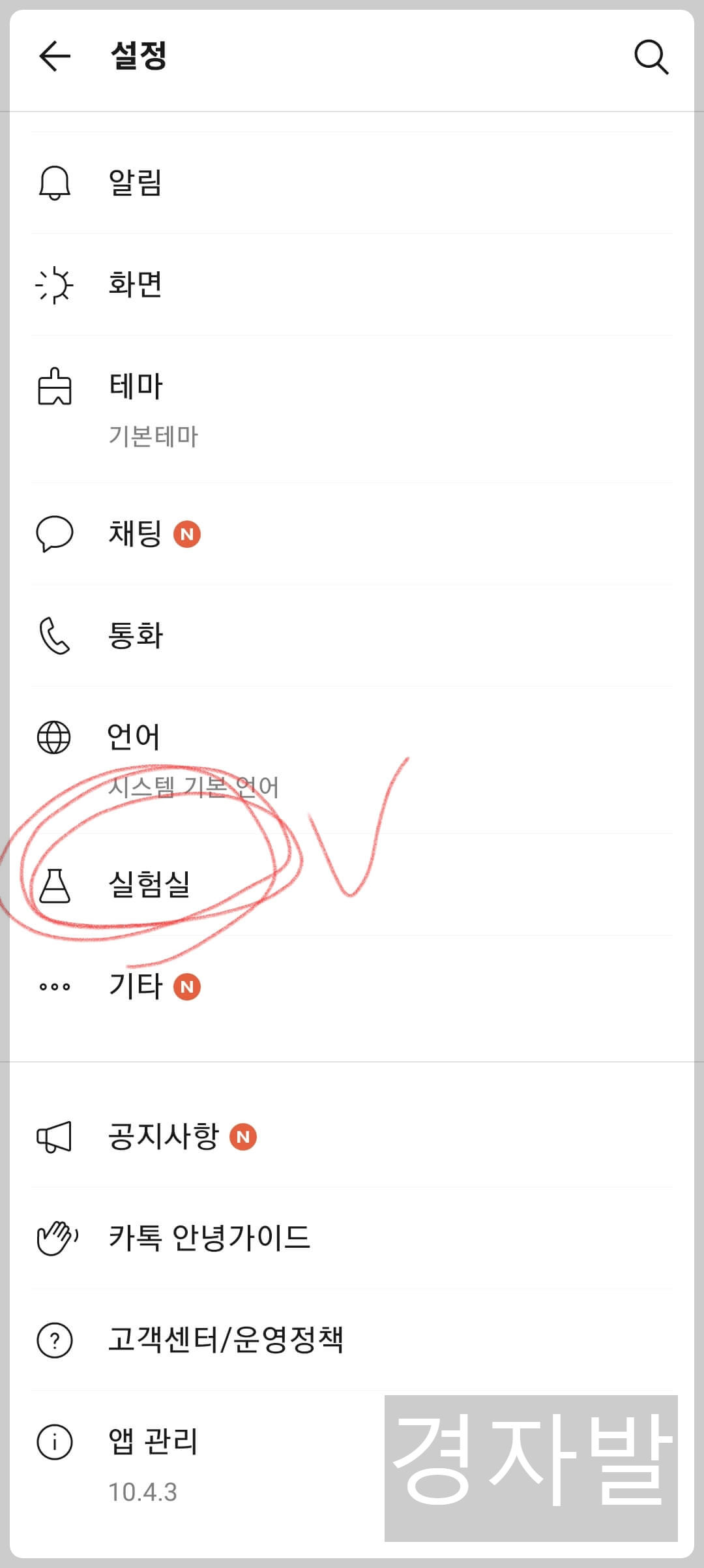 2. 설정화면에서 아래로 내려 실험실 메뉴를 누릅니다.