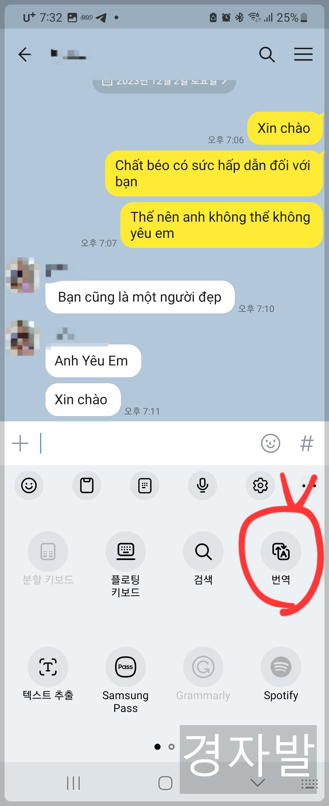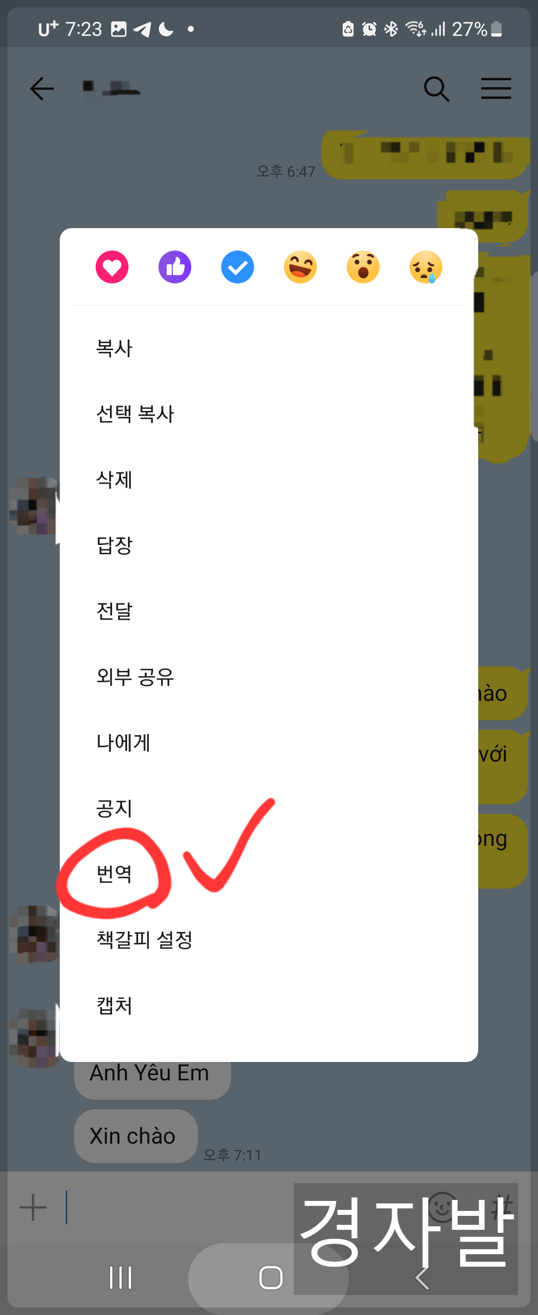 4. 카카오톡 대화창에서 번역하고싶은 문장을 3초정도 누르면 팝업창이 활성화 됩니다. 그 중 번역 버튼을 누릅니다.