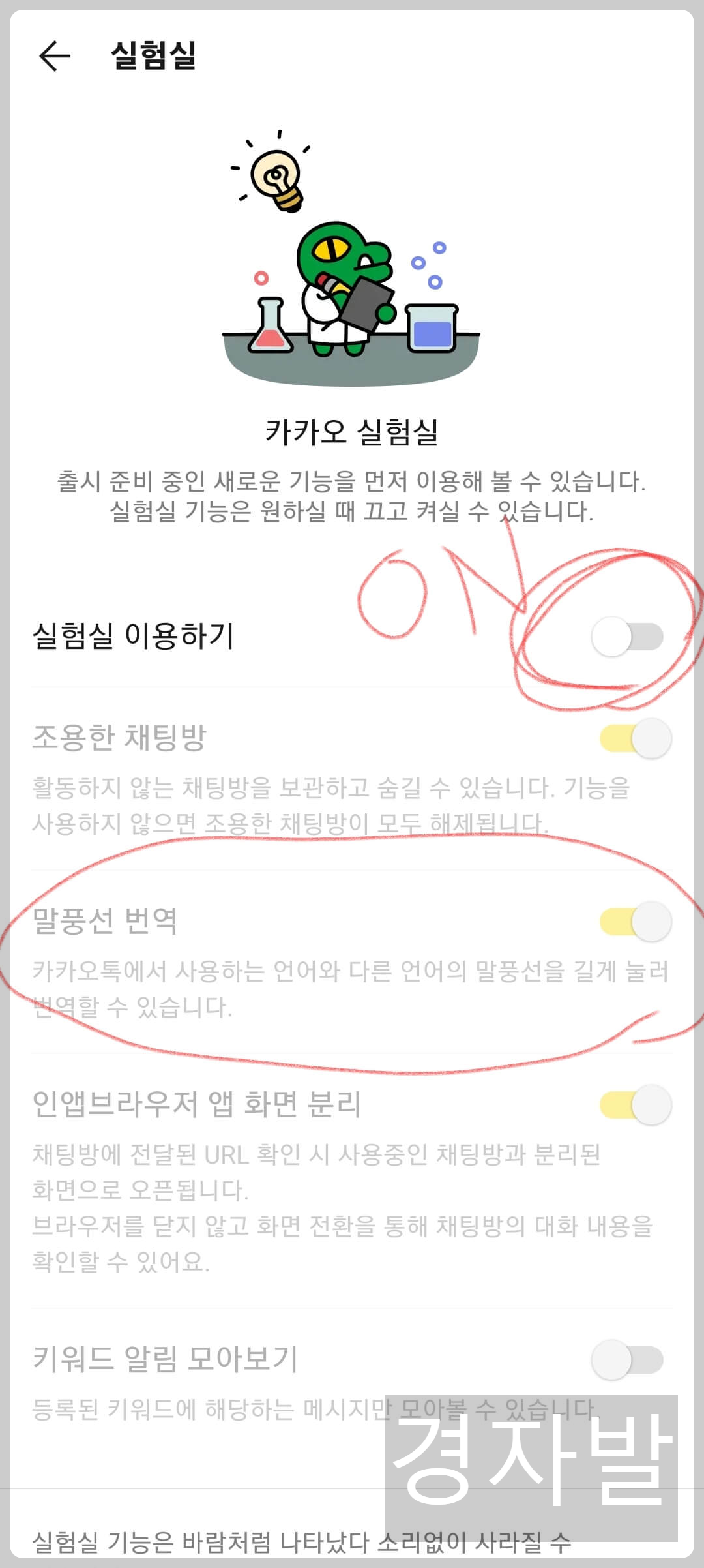 3. 실험실 이용하기 버튼을 활성화 시킵니다 (말풍선 번역 활성화)