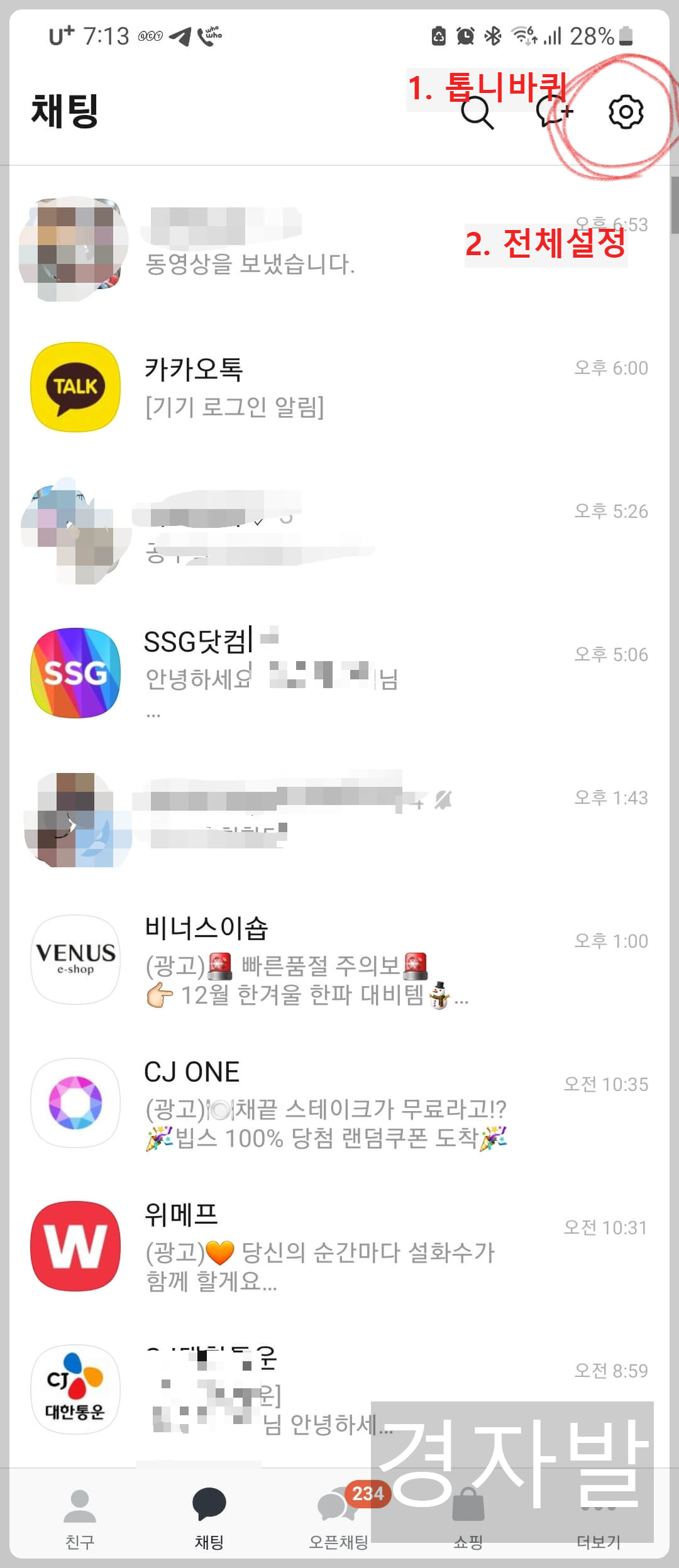 1. 카카오톡 화면에서 우측 상단의 설정버튼(톱니바퀴)를 누른 뒤, 전체 설정을 누릅니다.