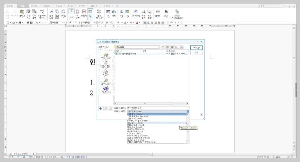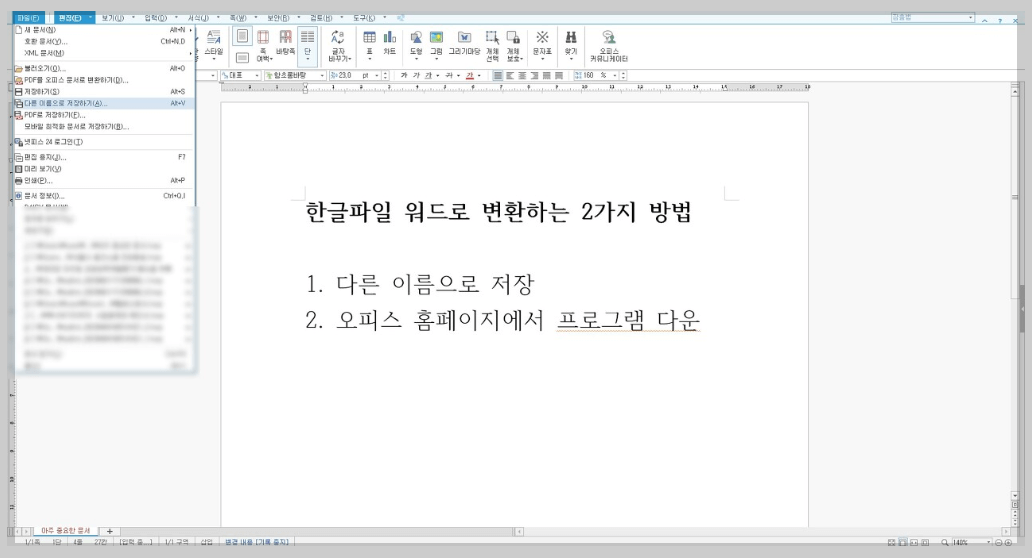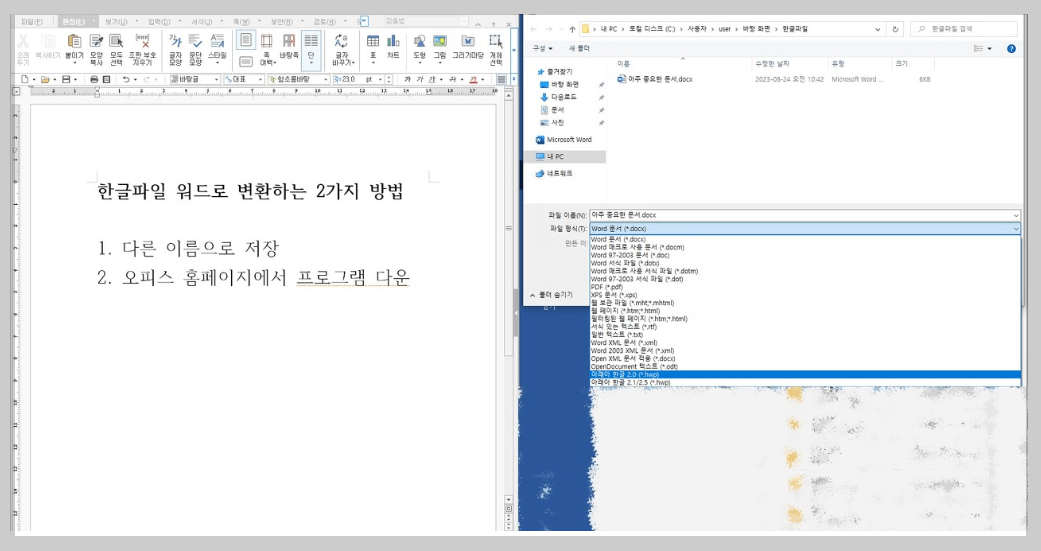 한글이 설치되어 있다면, 다른 이름으로 저장하여 워드 파일로 변환할 수 있습니다.