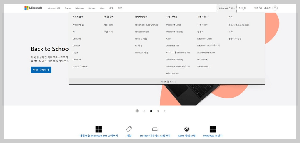 1. 마이크로 소프트 홈페이지에 접속하여 오른쪽 상단에 있는 microsoft 전체를 클릭 후 무료 다운로드 및 보안을 클릭합니다.