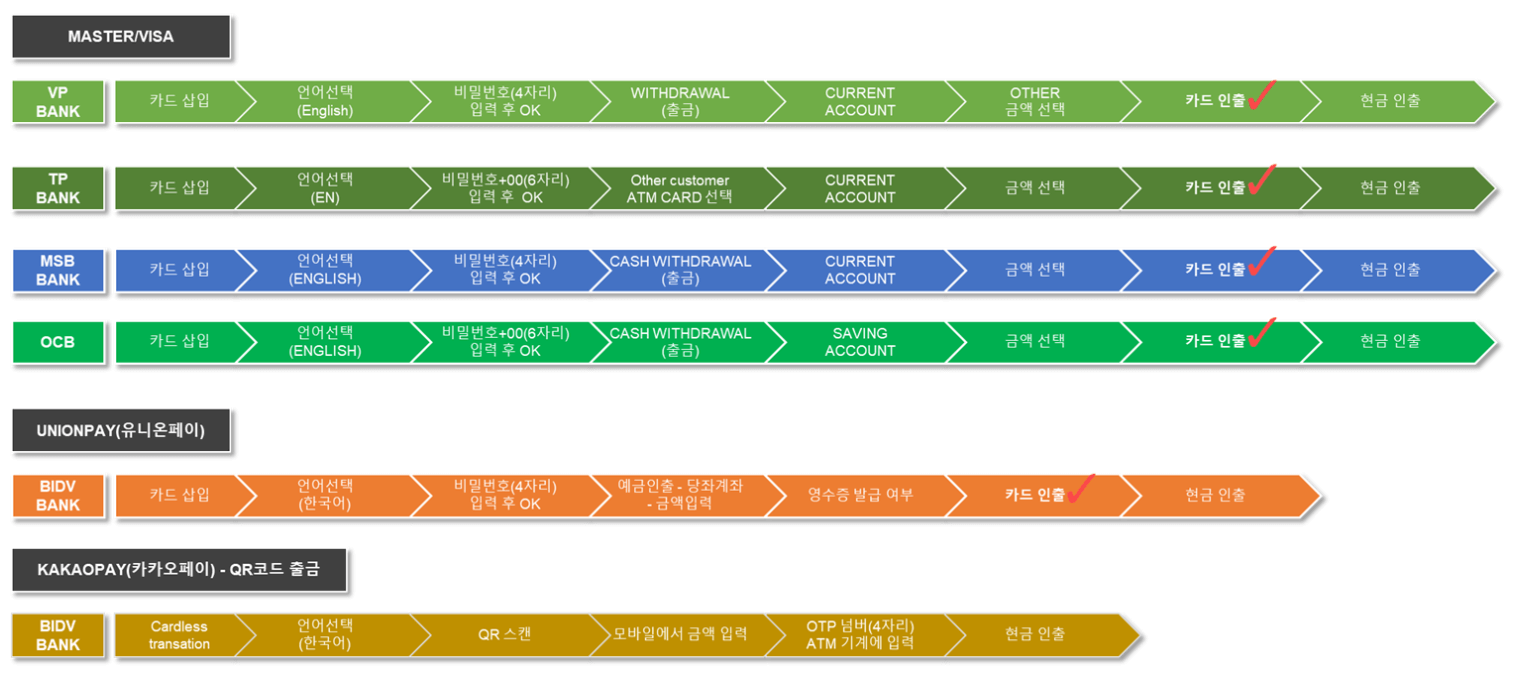 | VP BANK | 무료 | 유료 | 무료 | ATM : MAX 인출금액 200만동 / 1회 (여러번가능) |