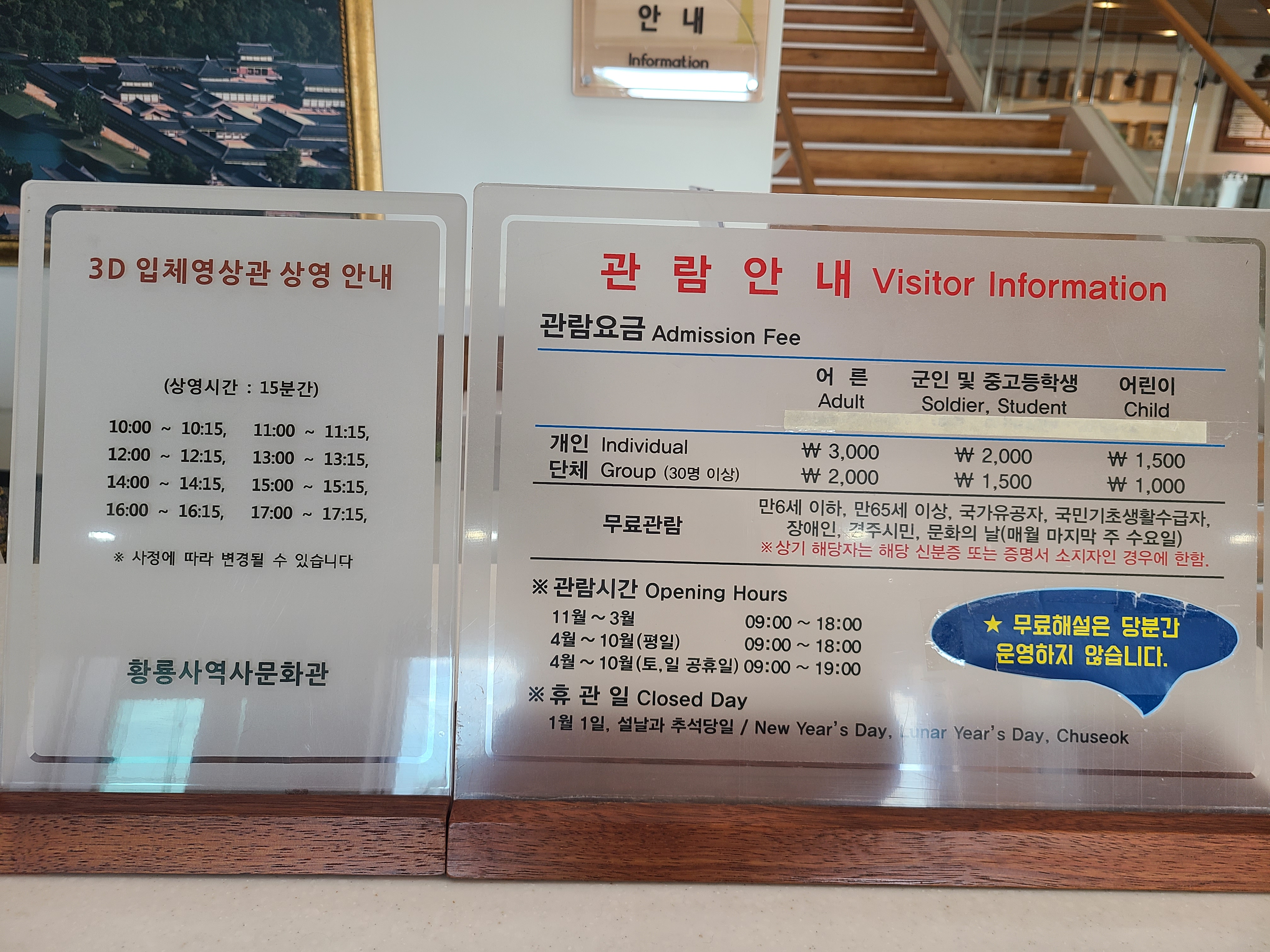 관람요금 : 어른 3,000원 청소년 2000원 어린이 1500원 6세 이하 무료